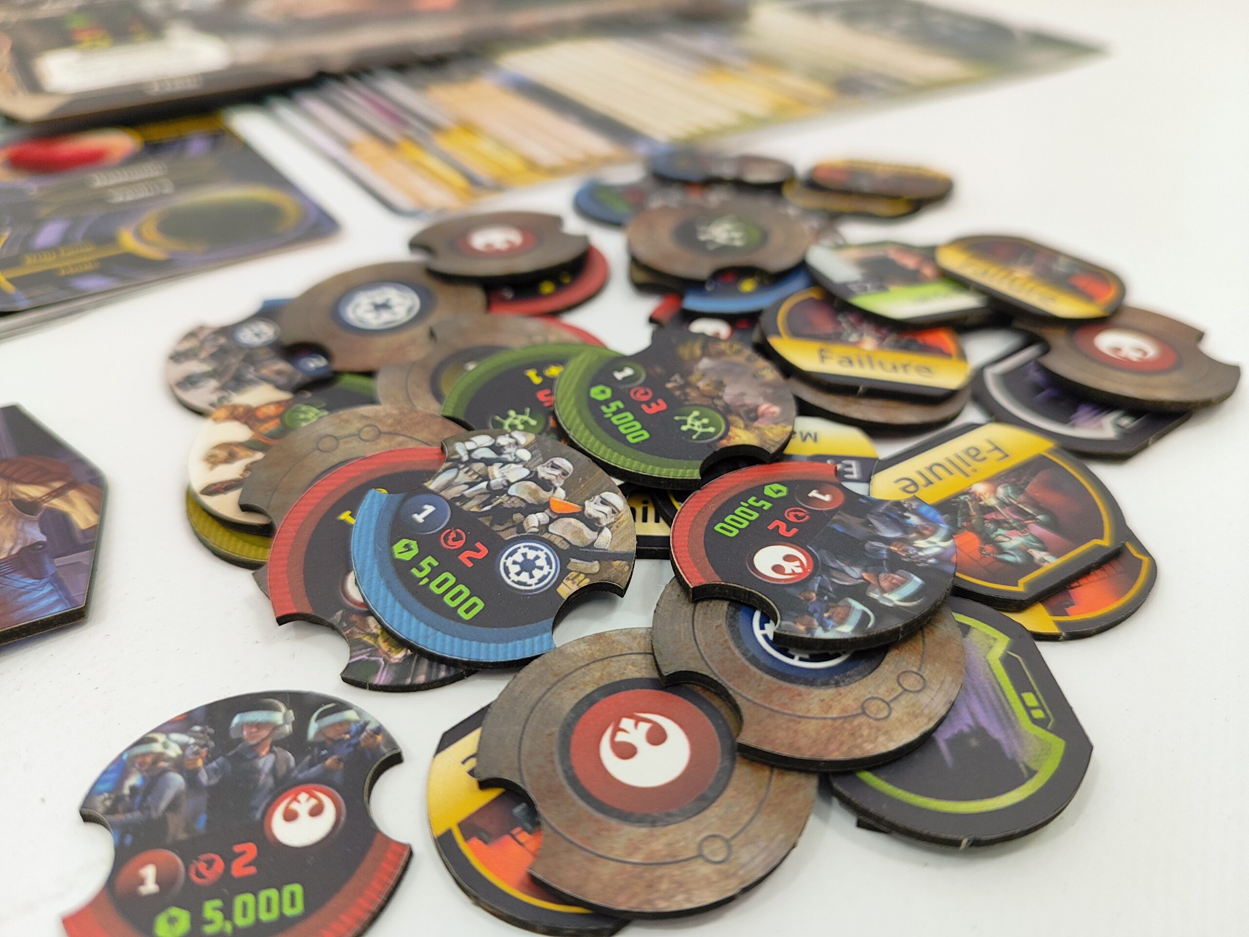 Precyzyjnie wycięte żetony/planszetki w różnych kształtach i grubościach, gotowe do gry.