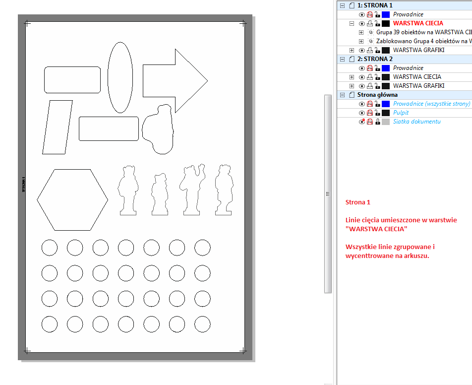 Instrukcja przygotowania pliku z żetonami, planszetkami i innymi elementami tekturowymi W MB PRINT dbamy o najwyższą jakość druku. Poprawne przygotowanie plików wpływa na efekt końcowy gry. Sprawdź nasze wskazówki, aby Twój projekt wyglądał perfekcyjnie również po wydruku. Żetony/Planszetki Karty Pudełka tekturowe spód-wieko Plansze składane Instrukcje Playmaty Pudełka karciane jednoczęściowe Makieta do projektowania żetonów Dopiero zaczynasz przygodę z samodzielnym przygotowywaniem żetonów do druku? Ułatwimy Ci zadanie! Pobierz instrukcję PDF Makieta do układania żetonów Podstawowe zasady przygotowania pliku do druku Format pliku: PDF. Rozdzielczość: 300 DPI. Kolorystyka: Preferowany tryb CMYK (profil Coated Fogra 39), pliki RGB zostaną automatycznie przekonwertowane co może wiązać się z różnicą w odcieniu kolorów. Głęboka czerń: by uzyskać głęboką czerń, użyj składowych: C:30% M:30% Y:0% K:100%. Spady: Dodaj 3 mm grafiki tła z każdej strony wszystkich żetonów poza format docelowy (np. żeton 20 x 25 mm powinien mieć ze spadem 26 x 31 mm). Margines bezpieczeństwa: Ważne teksty i grafiki umieść minimum 2 mm od krawędzi formatu docelowego (netto). Tekst: Wszystkie czcionki muszą być zamienione na krzywe. Znaczniki: Nie dodawaj linii cięcia ani paserów przy zapisie. Spłaszcz warstwy przed zapisem. Usuń efekty przezroczyste. Krok 1 Przygotowanie grafik pojedynczych żetonów Zanim zaczniesz układać żetony na arkuszu zbiorczym, musisz poprawnie przygotować plik graficzny dla każdego pojedynczego elementu. Aby wydruk był profesjonalny, każdy żeton musi spełniać dwa kluczowe warunki techniczne: mieć dodany spad oraz zachowany bezpieczny obszar. 1. Kluczowe definicje Spad drukarski (3 mm): To zewnętrzny margines grafiki, który wychodzi poza docelowy format żetonu. Jest niezbędny, aby po wycięciu na krawędziach nie zostały nieestetyczne, białe paski. Bezpieczny obszar: To wewnętrzny margines (odstęp od krawędzi cięcia). Wszystkie ważne elementy – takie jak teksty, ikony czy logotypy – umieść kilka milimetrów w głąb żetonu, aby nie zostały przypadkowo ucięte. 2. Zasady przygotowania pliku Aby uniknąć błędów w druku, stosuj się do poniższej listy kontrolnej: Wyciągnij tło na spad: Grafika (kolor, tekstura lub zdjęcie) musi wychodzić 3 mm poza linię cięcia. Unikaj białych ramek: Nie dodawaj białego obramowania jako spadu. Spad musi być naturalnym przedłużeniem grafiki żetonu. Biały spad jest dopuszczalny wyłącznie wtedy, gdy cały żeton jest biały. Usuń linie cięcia: W gotowym projekcie graficznym nie może być czarnej linii obrysowującej kształt żetonu. Linia cięcia (wykrojnik) zostanie nałożona w osobnym procesie. Przykładowo: Czarna linia – to zamierzona krawędź, po której nastąpi cięcie – nie może jej być w projekcie grafiki, zostanie dodana później. Spad – obszar grafiki za linią cięcia, który zapewnia pełne pokrycie krawędzi po przycięciu. Krok 2 Tworzenie linii cięcia Do przygotowania plików niezbędne jest użycie oprogramowania do grafiki wektorowej, takiego jak Corel Draw, Adobe Illustrator czy darmowy Inkscape. Pracę należy rozpocząć od pobrania i otwarcia szablonu w formacie A3 (dostępnego poniżej w dziale makiet), co pozwoli na precyzyjne rozmieszczenie wszystkich elementów pod kątem druku oraz cięcia. 1. Naniesienie linii cięcia na arkusz: Otwórz szablon w wybranym programie wektorowym Zaprojektuj rozmieszczenie żetonów na arkuszu, umieszczając ich kształty w warstwie „WARSTWA CIĘCIA”. 2. Zachowanie odstępów: Między poszczególnymi elementami zachowaj odstęp minimum 6 mm. Jest to konieczne, aby uniknąć problemów podczas wycinania. 3. Grupowanie i centrowanie: Po rozmieszczeniu żetonów zgrupuj je w jeden obiekt. Wycentruj całą grupę na arkuszu za pomocą skrótu klawiszowego „P” (w Corel Draw). 4. Odbijanie lustrzane i kopiowanie: Skopiuj całą grupę żetonów na drugą stronę (warstwa „WARSTWA CIĘCIA”). Odbij je lustrzanie w poziomie, aby linie cięcia pasowały do drugiej strony. 5. Eksportowanie pliku cięcia: Wyeksportuj obie strony do pliku PDF i nazwij plik w sposób opisujący jego zawartość, np.: Kowalski_zetony_ciecie.pdf. Upewnij się, że plik zawiera tylko linie cięcia i elementy z szablonu wzorcowego. Dla przykładu może to wyglądać tak: Krok 3: Przygotowanie stron arkusza z grafikami 1. Dodanie grafik z awersami żetonów: Na pierwszej stronie przygotowanego arkusza, na którym znajdują się linie cięcia, umieść swoje obrazy i grafiki w nowej warstwie o nazwie „WARSTWA GRAFIKI”. 2. Ukrycie warstwy cięcia: Ukryj warstwę „WARSTWA CIĘCIA”, a następnie wyłącz jej drukowanie i eksportowanie. 3. Dodanie grafik z rewersami żetonów: Przejdź na drugą stronę arkusza i umieść grafiki rewersów w taki sposób, aby odpowiadały grafikom z przedniej strony. Upewnij się, że grafika z lewej strony z przodu odpowiada grafice z prawej strony na rewersie. 4. Elementy jednostronne: Jeśli żetony mają być jednostronne, pozostaw rewers pusty lub wypełnij go wybranym kolorem. 5. Eksportowanie tylnej strony: Ukryj warstwę „WARSTWA CIĘCIA”, a następnie wyłącz jej drukowanie i eksportowanie. Wyeksportuj grafikę do pliku PDF, nazwij go np.: Kowalski_zetony_grafika.pdf Dla naszego przykładu może to wyglądać tak: Krok 4 Finalny eksport pliku 1. Łączenie warstw i eksport: Włącz widoczność wszystkich warstw, włącz drukowanie i eksportowanie wszystkich warstw. Wyeksportuj finalny plik PDF, który będzie zawierał grafikę żetonów oraz widoczne linie cięcia, np.: Kowalski_zetony.pdf. 2. Gotowe pliki: Teraz masz trzy pliki PDF: Kowalski_zetony_ciecie.pdf Kowalski_zetony_grafika.pdf Kowalski_zetony.pdf. Dołącz utworzone pliki podczas składania zamówienia na druk żetonów. Wskazówka Jak obniżyć koszt druku żetonów Przygotowanie kilku
